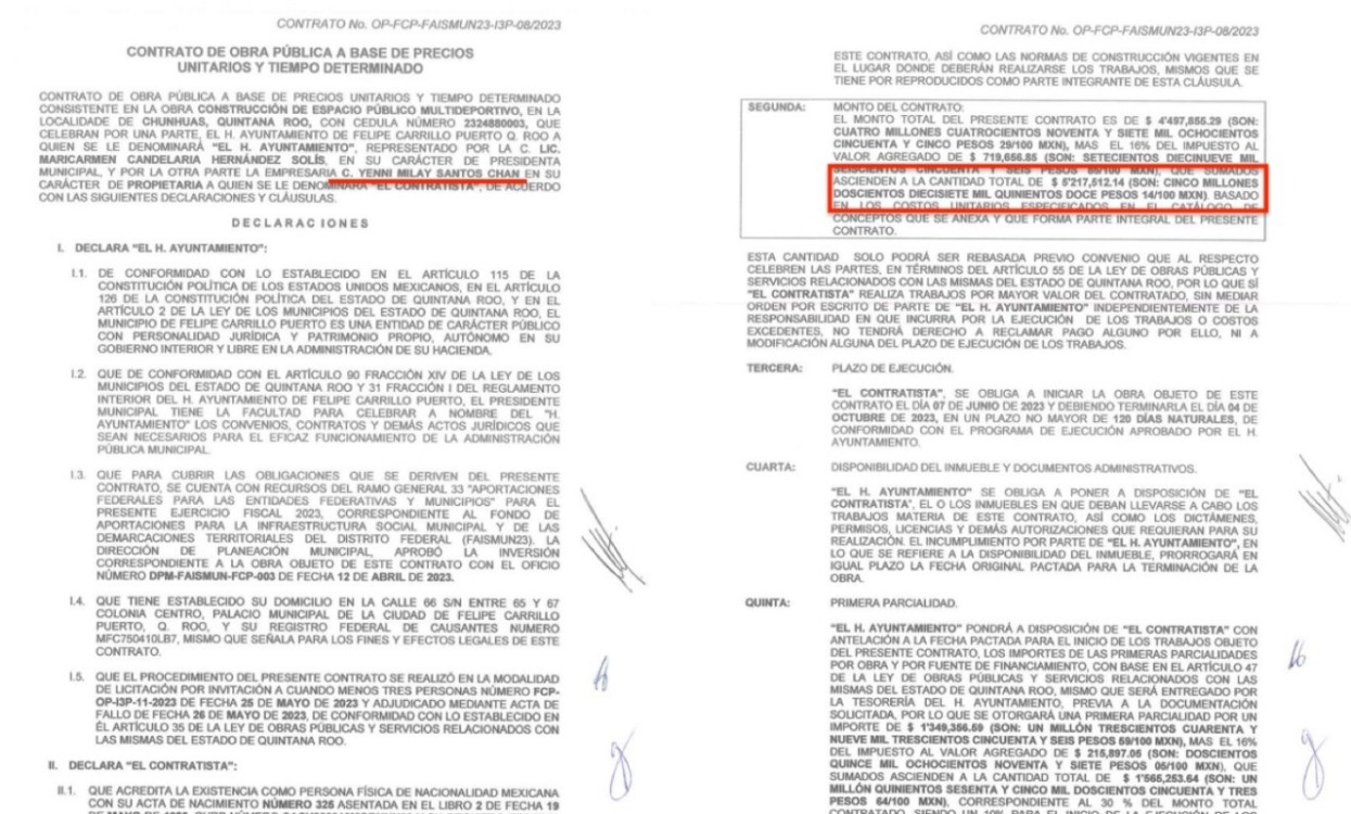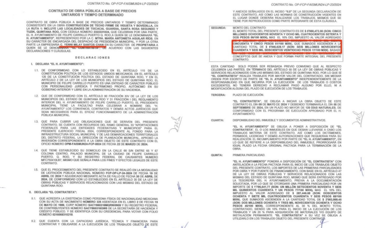 Antes, el 3 de mayo de 2024, se firmó el contrato OP-FCP-FAISMUN24-LP-23/2024 para la construcción de techo firme de vigueta y bovedilla, en la Ruta 1: incluye las localidades de Tixcacal, Guardia, Santa Rosa Segundo y Tuzik por un monto de $6 millones 946 mil 628.17 pesos. El contrato fue avalado por María Antonieta Aguilar Ríos, quien era encargada del despacho de la Presidencia Municipal.