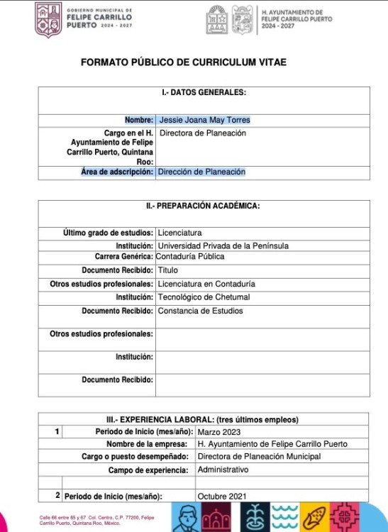Jessie Joana May Torres, quien según su currículo se ostenta como Licenciada en Contaduría Pública por la Universidad Privada de la Península, con su título en trámite, es muy cercana a la alcaldesa Maricarmen Hernández, por ello es la coordinadora general del COPLADEMUN en FCP; es decir, si bien, no define los contratos, sí sabe cuáles son las obras públicas planeadas en este municipio, por lo que tiene información de primera mano.