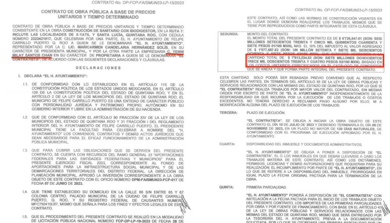 El contrato OP-FCP-FAISMUN23-LP-15/2023, fechado el 4 de julio de 2023, tenía como objeto la construcción de sanitario con biodigestor (construcción de cuarto para baño con construcción de sanitario con biodigestor) en la ruta 7, incluye las localidades de X-Yatil y Santa Lucía y un monto de $7 millones 813 mil 234.53 pesos.