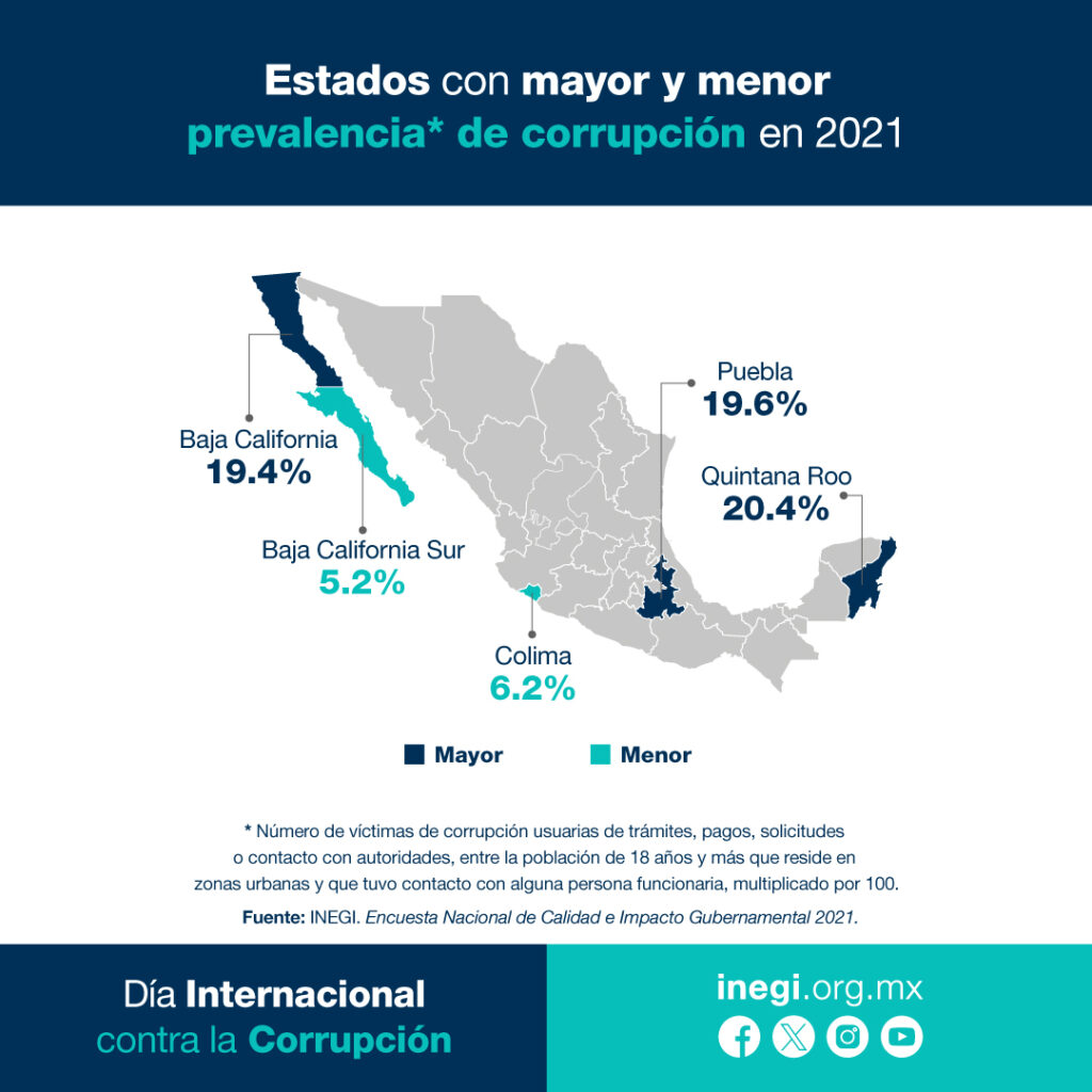 La medición del Inegi fue del año 2021, en el entonces gobierno de Carlos Joaquín González; a nivel nacional, Quintana Roo ocupa el primer lugar en corrupción con un 20.4%, seguido por Puebla con 19.6% y en tercer sitio está Baja California con 19.4%. Por el contrario, Baja California Sur y Colima presentaron los menores porcentajes.