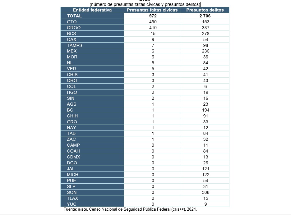 El resultado del Censo Nacional de Seguridad Pública Federal (CNSPF) 2024, presentado por el Instituto Nacional de estadística y Geografía (Inegi), las entidades federativas donde la Guardia Nacional registró el mayor número de presuntas faltas cívicas fueron Guanajuato y Quintana Roo, con 490 y 410 registros, respectivamente. Asimismo, las entidades federativas en donde se registró el mayor número de presuntos delitos fueron Quintana Roo y Sonora, con 337 y 308, respectivamente; algo que deben de considerar las autoridades locales encargadas de vigilar la paz y la tranquilidad de los ciudadanos.