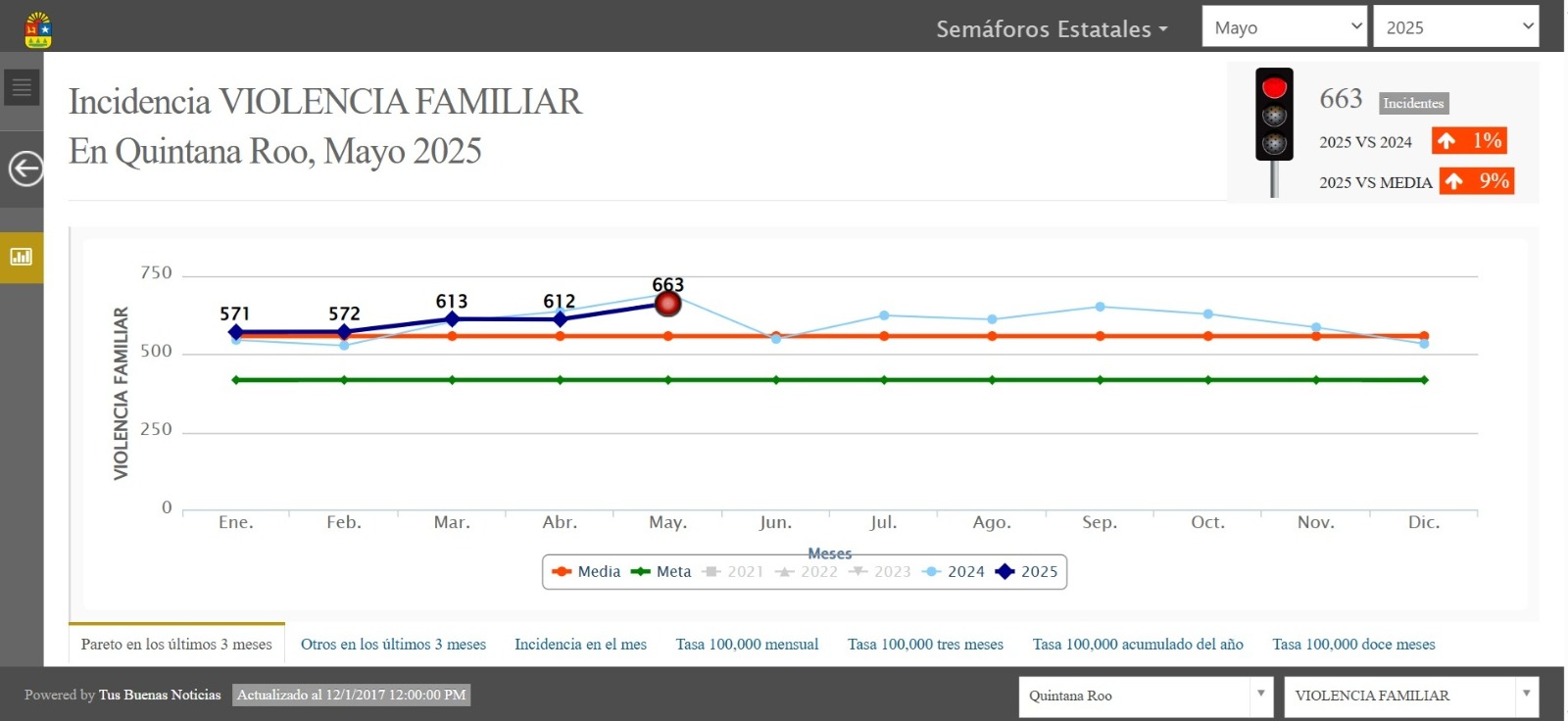 Con información de la Plataforma de Incidencia Delictiva, Observatorio Nacional Ciudadano, en enero de este 2025, Quintana Roo reportó 571 casos, o sea un 29.93% de todos los delitos; en febrero fue de 572 quejas, un 29.98%; en marzo fue de 613, con un 32.13 por ciento; abril, 612, representando 32.08%; mayo fue el mes más alto con 663 casos y un 34.75%; finalmente, junio terminó con 652 casos, es decir un 34.12% del total de los delitos en la Entidad.