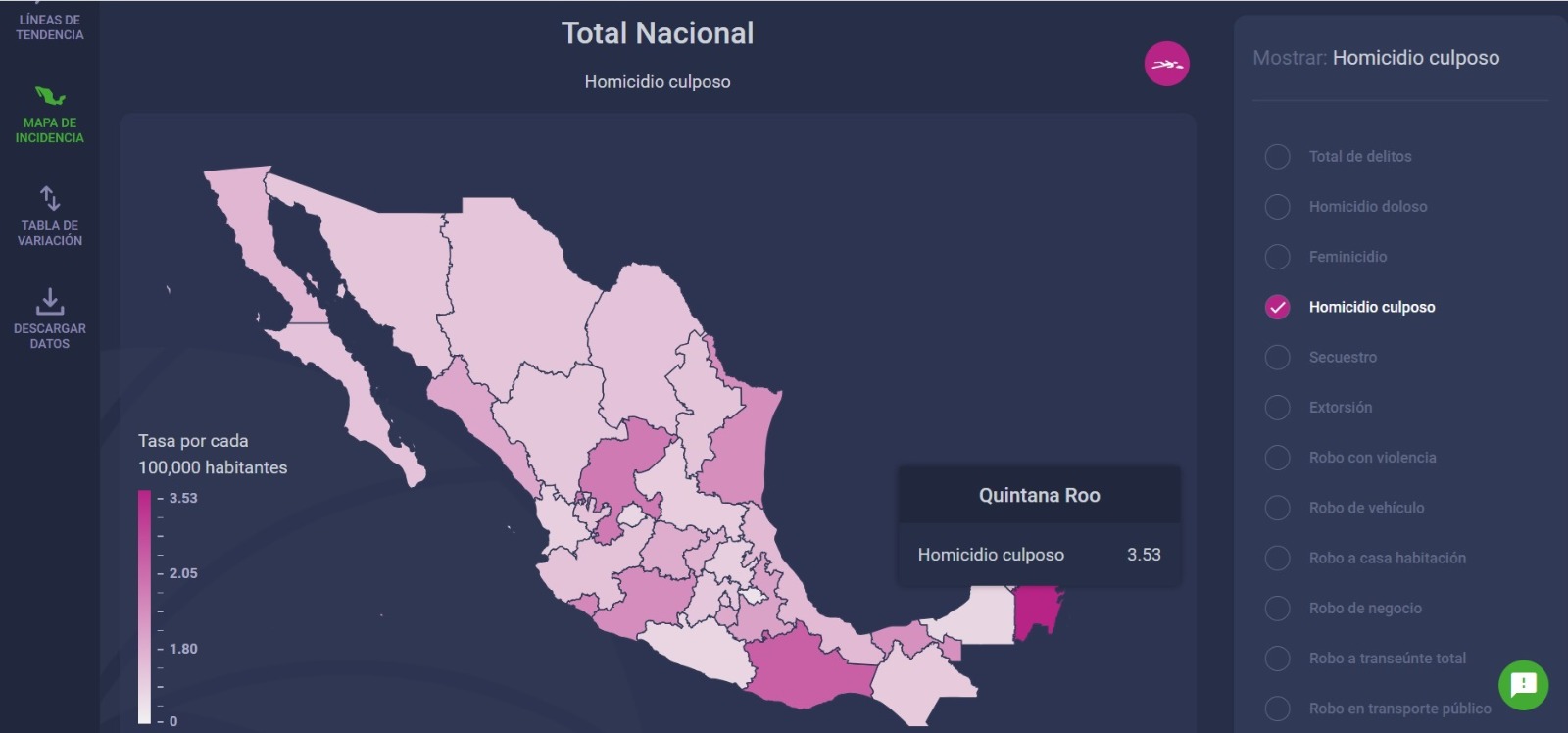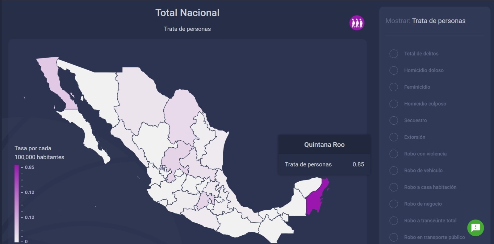 Pero donde nos llevamos el primer lugar, por mucho, es en la trata de personas, porque de las 32 entidades, en Quintana Roo tenemos 0.85 eventos por cada 100 mil habitantes. Esto quiere decir que hay mafias específicas, más allá de las del narcotráfico, que fomentan este tipo de delito; por cada golpe que la autoridad realiza con la detención de los culpables y de la liberación de las víctimas, hay un 80 por ciento que no se detecta.