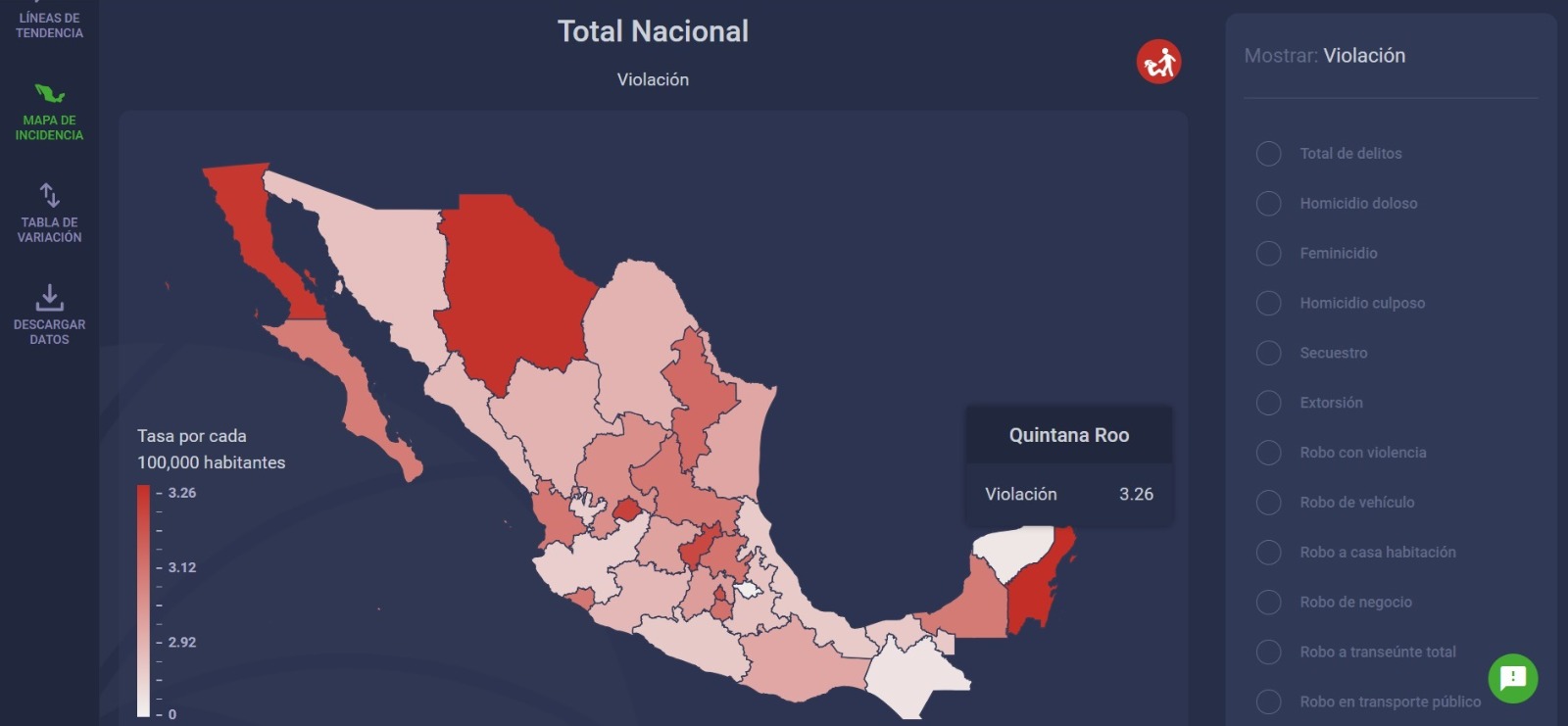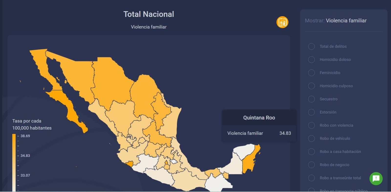 Estado con 9.13 hechos por cada 100 mil habitantes; en violaciones, estamos con 3.26 eventos por cada 100 mil habitantes y; la violencia intrafamiliar llega a 34.83 actos por cada 100 mil habitantes.