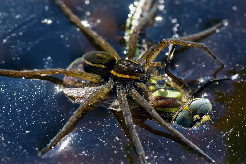 Aunque tienen un tamaño realmente intimidante, son 100% inofensivas para los humanos. Su dieta se basa en peces, pájaros y roedores. Encima de su tamaño, estas arañas tienen una habilidad única y es que pueden “caminar” sobre el agua. Ellas tienen unos micro pelos en sus patas los cuales son repéletenos del agua, esto sumado a la agilidad y bajo peso de la araña, le permite este desplazamiento.