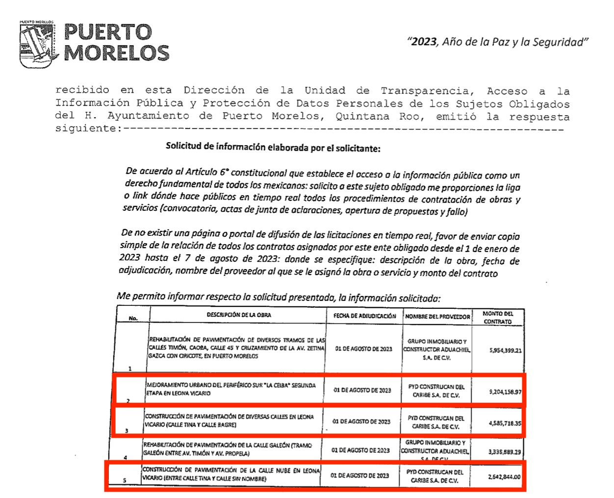 Según la respuesta proporcionada por el propio Ayuntamiento de Puerto Morelos, el pasado 28 de agosto vía el oficio DUTAIP-PM/AJ/231288200048923/2773/2023, se señala que el primer contrato asignado por la Secretaría de Obras y Servicios Públicos Municipales, que preside Hugo Federico Garza Sáenz, fue para el mejoramiento urbano del Periférico Sur “La Ceiba”, segunda etapa, por un monto de 9 millones 204 mil 158.97 pesos.