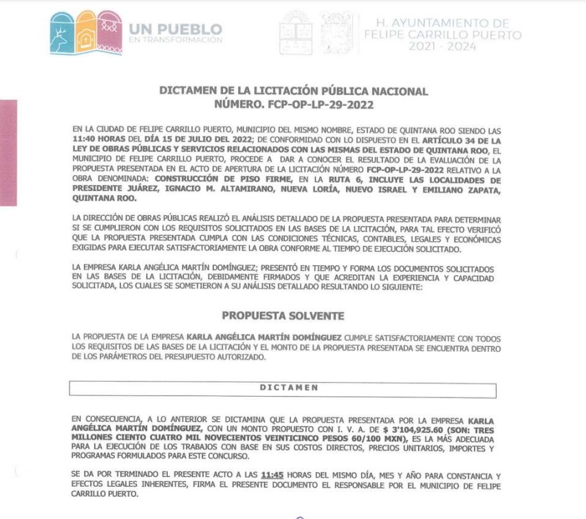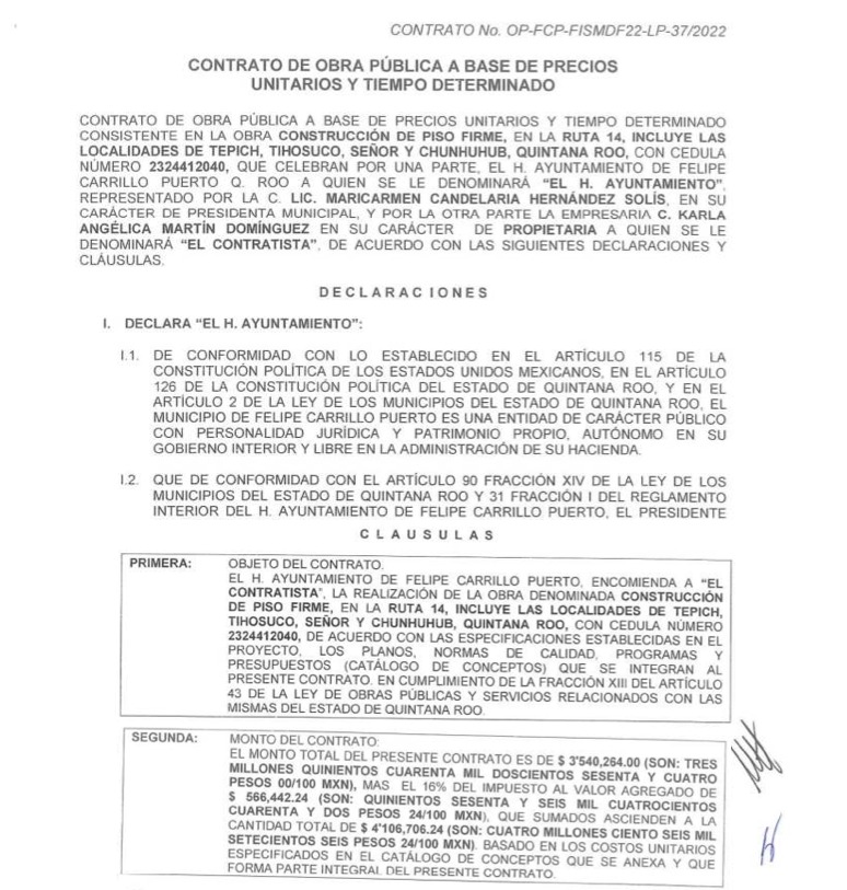 Posteriormente el 19 de junio de 2022 llegaron otros dos contratos para Karla Angélica Martín Domínguez. El primero fue el contrato OP-FCP-FISMDF22-LP-37/2022 para la realización de la obra denominada construcción de piso firme Ruta 14 incluye las localidades de Tepich, Tihosuco, Señor y Chunhuhub por un monto de 4 millones 106 mil 706.24 pesos.