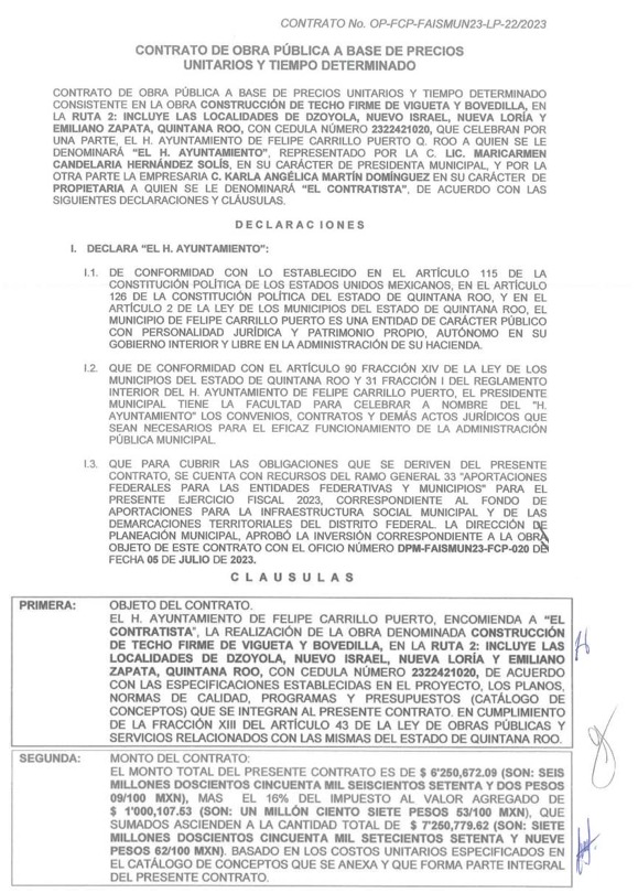El más reciente contrato otorgado a Karla Angélica Martín Domínguez se firmó apenas el 4 de agosto de 2023 y es el número OP-FCP-FAISMUN23-LP-22/2023 para la realización de la obra denominada construcción de techo firme de vigueta y bovedilla en la Ruta 2, que incluye las localidades de Dzoyola, Nuevo Israel, Nueva Loria y Emiliano Zapata por la suma de 7 millones 250 mil 779.62 pesos.