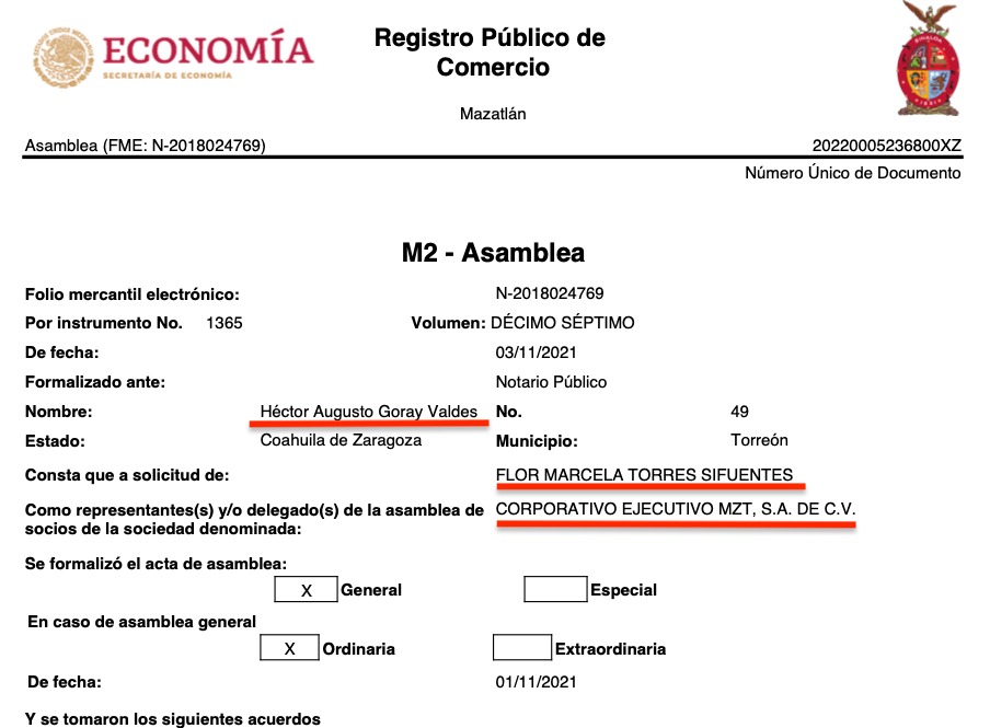 En noviembre de 2017 había nacido en Mazatlán la firma Corporativo MZT, fundada por Martha Beatriz Arredondo Benítez y Nora Lina Rendón Benítez, orientada al ramo contable. Para 2021 ya fungía como delegada especial de la sociedad Flor Marcela Torres Sifuentes, y en menos de tres años cambió cinco veces de objeto social, de acuerdo con los datos registrales, para sintonizarlo con la orientación del Grupo Intermex.
