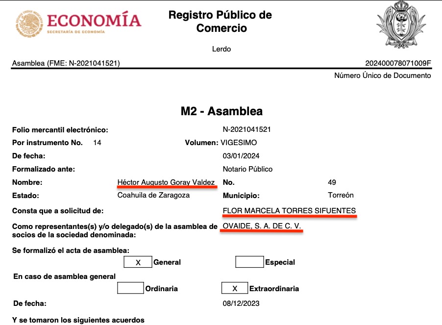 Está además Ovaide, fundada en Lerdo en 2013 por Felipe Méndez López, accionista, a su vez, de Global Intermex,  y Victoria Hernández Martínez; a la que se integraron en 2021, como apoderados, Ana Karen Fierro Medina, Javier González Ruiz, y José de Jesús Orozco Escalera; además de Flor Marcela Torres Cifuentes, delegada especial de la sociedad.