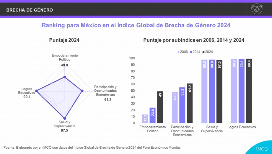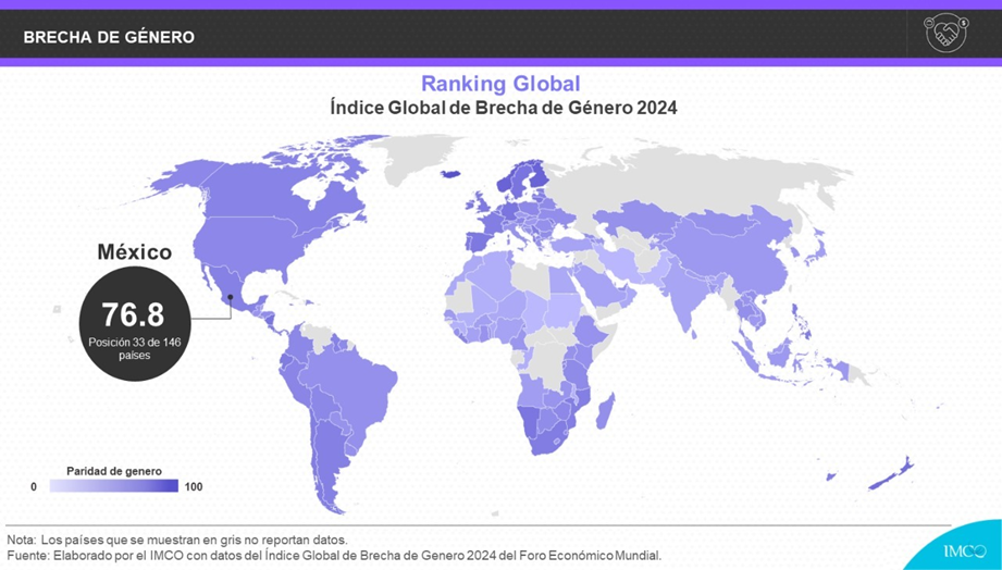 De acuerdo con el Índice Global de Brecha de Género del Foro Económico Mundial (WEF, por sus siglas en inglés), entre 2006 y 2023, la igualdad de género avanzó de 64.3 a 68.5 en una escala de 0 a 100. El progreso es lento y a este ritmo tomará 134 años cerrar las brechas de género en el mundo, es decir, hasta cinco generaciones. El Instituto Mexicano para la Competitividad (IMCO), como socio local del WEF, analizó los resultados para México. En 2024, México obtuvo un puntaje de 76.8, por encima del ranking mundial.