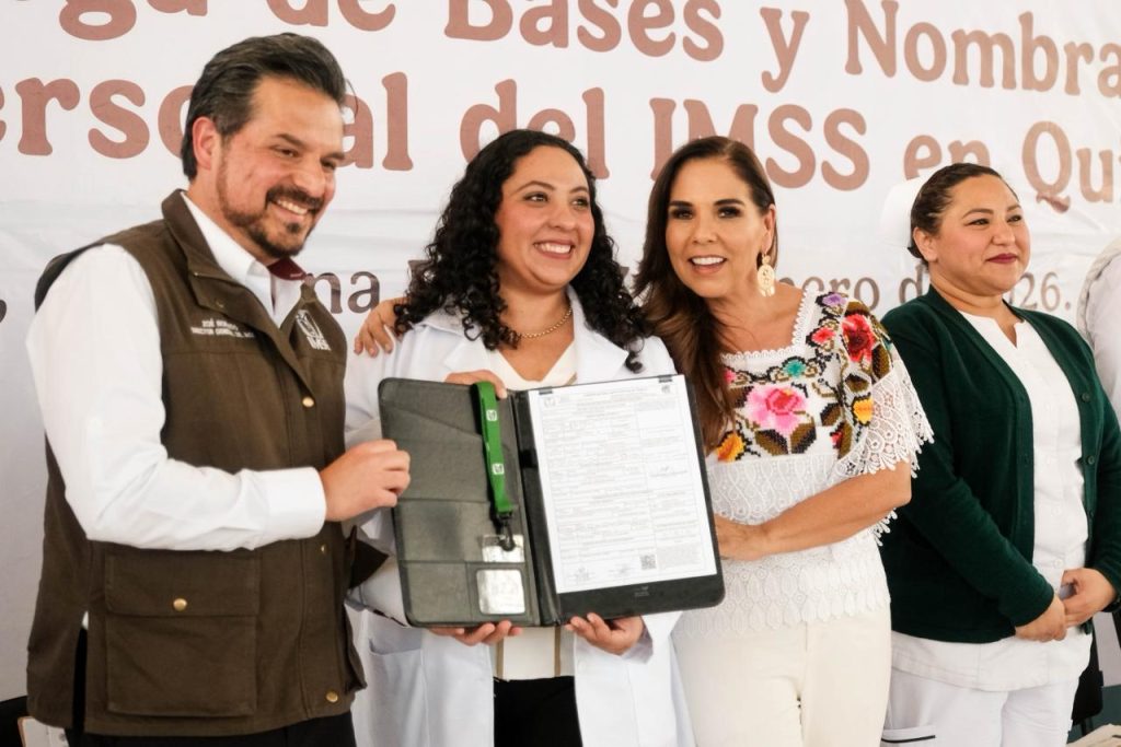 Cancún.- Un total de 71 colaboradoras y colaboradores del Instituto Mexicano del Seguro Social (IMSS) en Quintana Roo recibieron sus bases laborales durante un evento encabezado por la gobernadora Mara Lezama Espinosa y el director general del IMSS, Zoé Robledo.