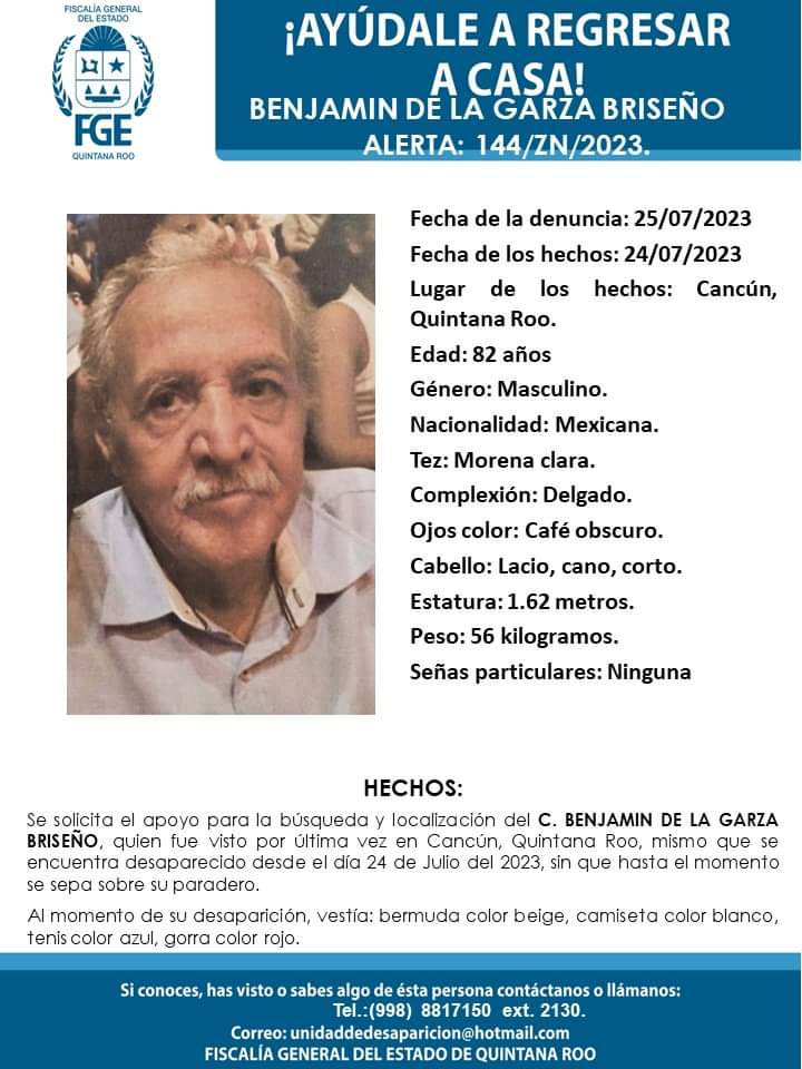 El señor Benjamín de la Garza Briseño, fue visto por última vez en Cancún, al momento de su desaparición vestía: bermuda color beige, camiseta color blanco, tenis color azul, gorra color roja.