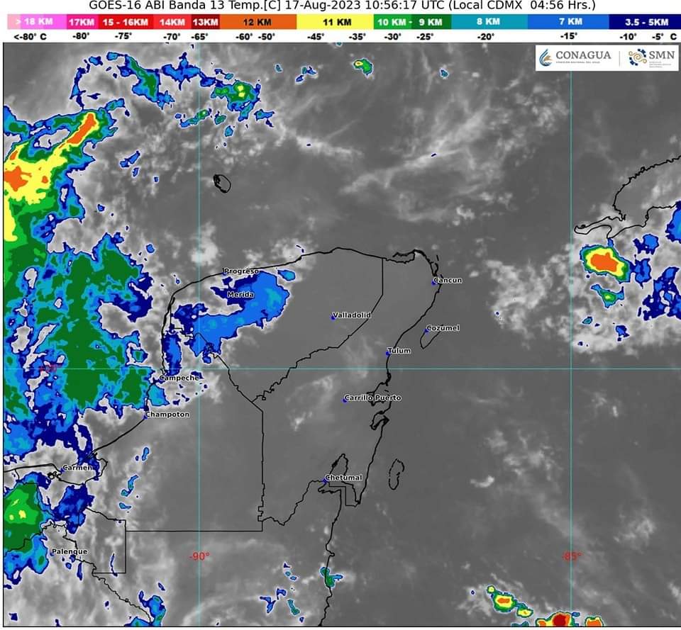 Se mantiene la afluencia de aire húmedo proveniente principalmente del Mar Caribe y del Golfo de México hacia la región peninsular, mantendrá las condiciones de cielo parcialmente nublado con incremento de nublados durante el transcurso del día, lluvias y chubascos dispersos acompañados de actividad eléctrica más frecuentes por la tarde y noche sobre algunas zonas del Estado de Quintana Roo, las temperaturas serán muy calurosas a bochornosas durante el transcurso del día y cálidas a calurosas por la noche y madrugada sobre el Estado.