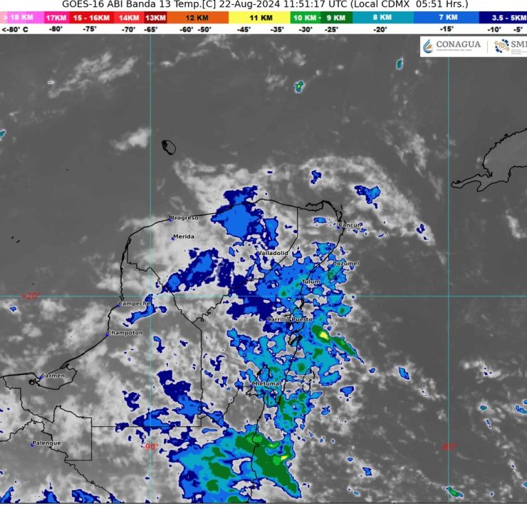En Felipe Carrillo Puerto, se pronostican lluvias moderadas, acompañadas de temperaturas altas, que oscilarán entre 35 y 37°C, con una sensación térmica de 40°C.