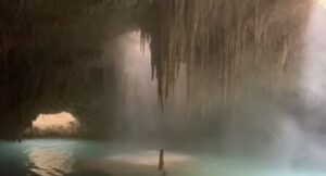 En videos compartidos por el colectivo se aprecia la caída del material del techo de la cueva y caen al agua del río.