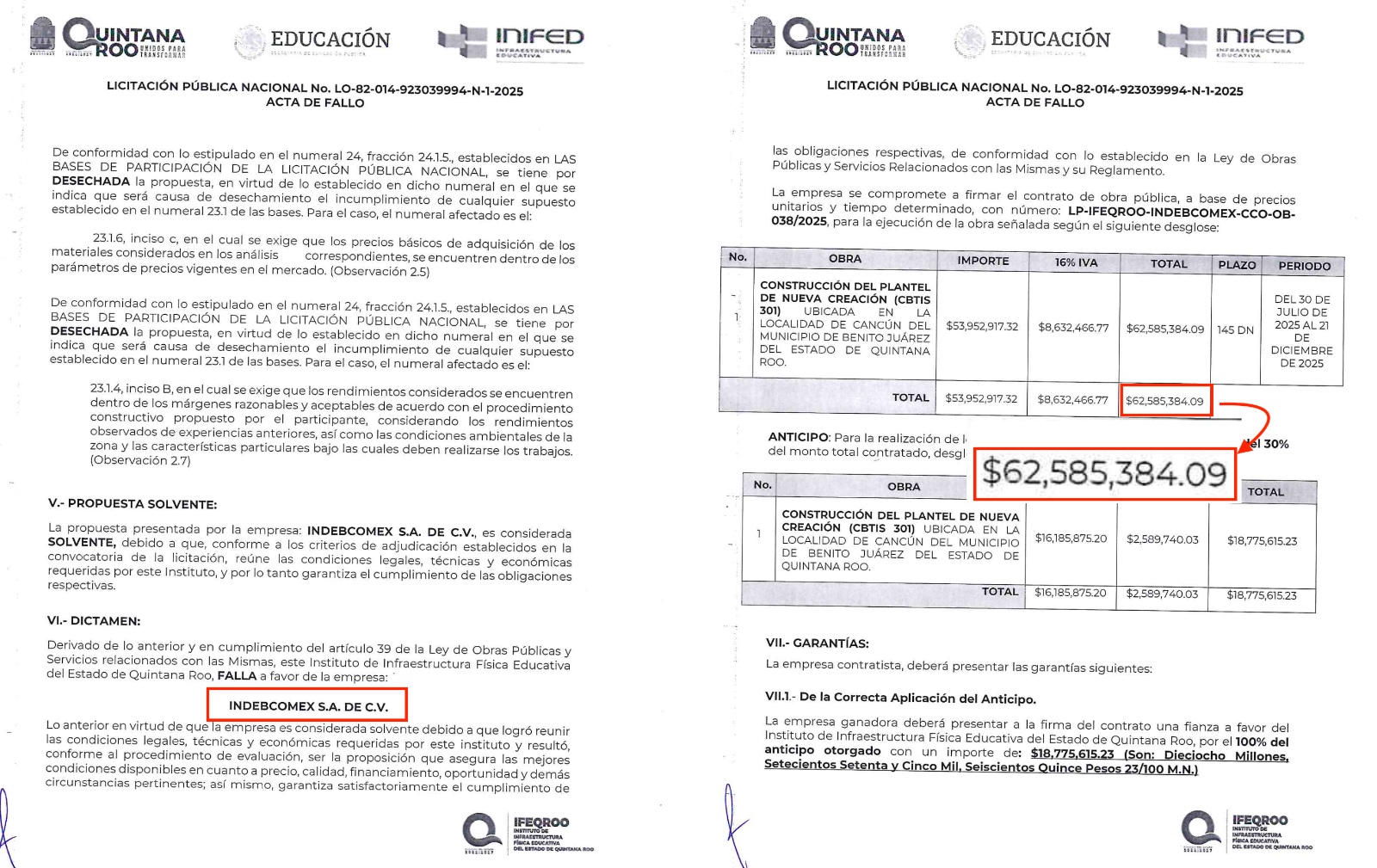La empresa de Guadalajara, Jalisco, INDEBCOMEX SA de CV obtuvo el contrato millonario para la construcción del plantel de nueva creación (CBTIS 301) ubicado en la zona de Cuna Maya de Cancún, e. la que el Instituto de Infraestructura Educativa de Quintana Roo (Ifeqroo) invertirá la suma total de $62 millones 585 mil 384.09 pesos.