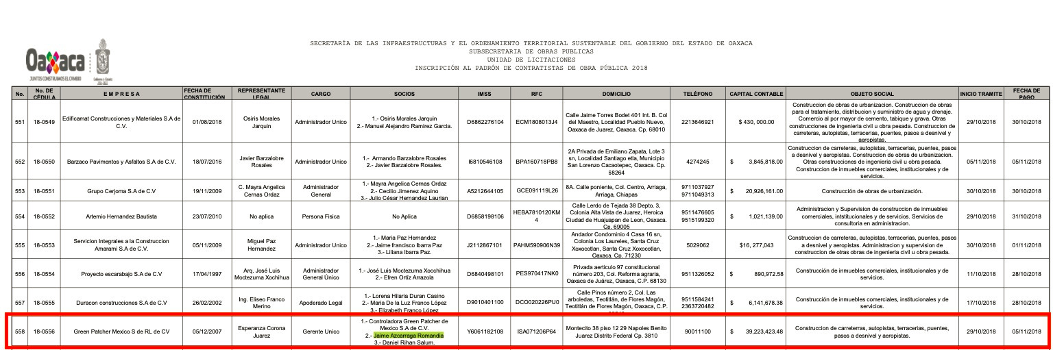 Sin embargo, en la Inscripción al Padrón de Contratistas de Obra Pública 2018 de la Secretaría de las Infraestructuras y el Ordenamiento Territorial Sustentable del Gobierno del Estado de Oaxaca se informa que la razón social Green Patcher México SA de CV, tiene como socios a Controladora Green Patcher de México S.A de C.V., Jaime Azcárraga Romandía y Daniel Rihan Salum, quien comparte con Azcárraga el gusto por la equitación.
