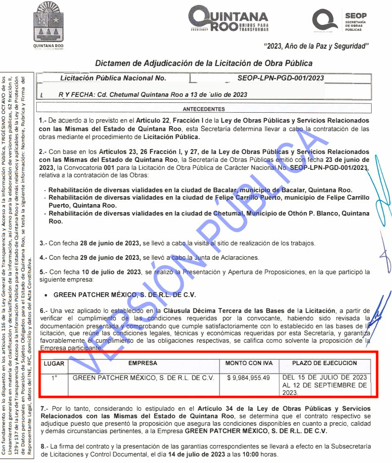 La licitación convocada SEOP-LPN-PGD-001-2023 es para la rehabilitación de diversas vialidades en la ciudad de Bacalar, Felipe Carrillo Puerto y Othón P. Blanco que fue adjudicada a la empresa Green Patcher México S de RL de CV, por un monto de $9,984,955.49 pesos (IVA incluido).