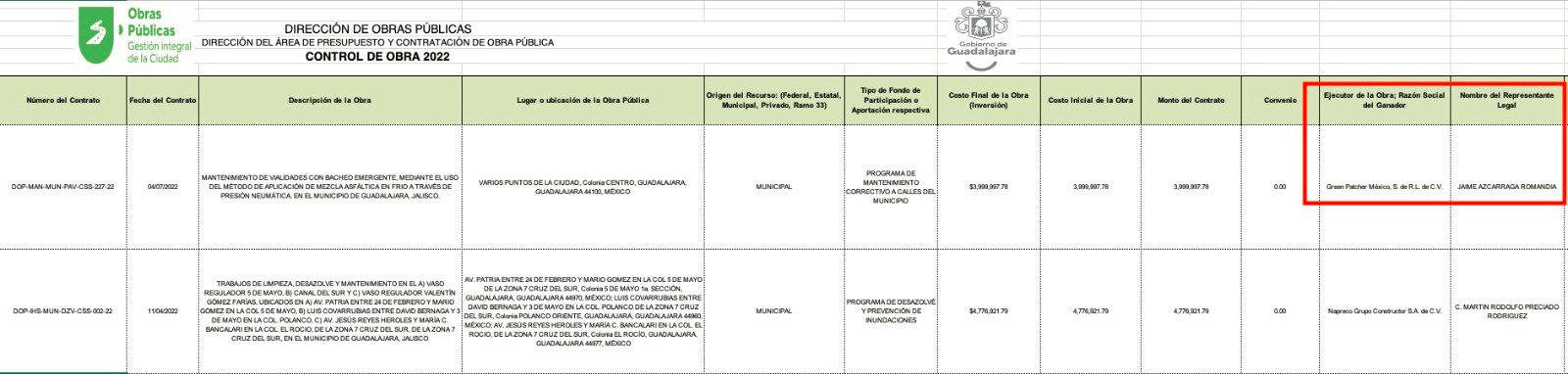 Al consultar los registros de la empresa y contratos, como el registro o control de obras 2022 en el municipio de Guadalajara, Jalisco, uno de los nombres que sale a relucir es el de Jaime Azcárraga Romandía, presidente ejecutivo de la cadena Grupo Fórmula, quien aparece como representante legal de la empresa.