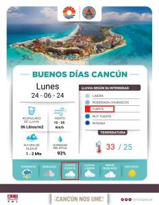 Habrá chubascos, la Dirección de Protección Civil de Cancún informó que se pronostica cielo nublado, con probabilidad de intervalos de chubascos y lluvias puntuales fuertes acompañadas de posible actividad eléctrica. Ambiente muy caluroso a bochornoso. Viento del sureste y este de 15 a 25 kilómetros por hora con rachas más fuertes con una sensación térmica de hasta 36 grados Celsius.