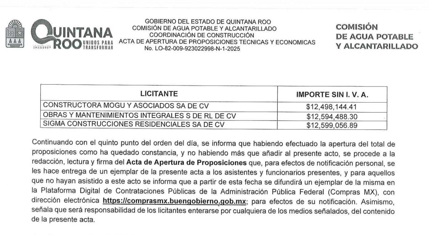 La última es la licitación LO-82-009-923022998-N-1-2025 para la construcción de línea de conducción (acueducto tramo Felipe Ángeles-Guillermo Prieto) para el abastecimiento de agua potable del acueducto “Dos Aguadas”, municipio de Othón p. Blanco (cadenamiento 0+000 al 4+500) donde participan las empresas Constructora Mogu y Asociados SA de CV, con $12’498,144.41 pesos; Obras y Mantenimientos Integrales S de RL de CV, con $12’594,488.30 pesos; y Sigma Construcciones Residenciales SA de CV, de Mérida, Yucatán, propiedad Rolando José Loroño Pino, que ofertó $12’599,056.89 pesos.