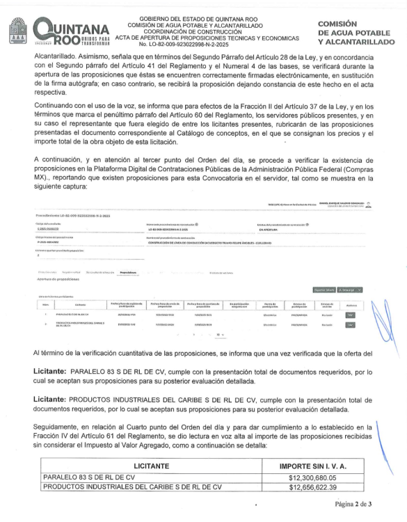 La LO-82-009-923022998-N-2-2025 para la construcción de línea de conducción (acueducto tramo Felipe Ángeles – Guillermo Prieto) para el abastecimiento de agua potable del acueducto “Dos Aguadas”, municipio de Othón P. Blanco, donde participan la empresa chetumaleña Paralelo 83 S de RL de CV, de Idalia Lizzette Carrillo Beltrán y Jorge Humberto Vivanco Carrillo (socio también de Obras y Mantenimientos) que ofertó $12’300,680.05 pesos; y la campechana Productos Industriales del Caribe S de RL de CV, de Luis Alfonso Méndez Lara y Mauricio Fernando Martínez Albarrán, que propuso $12’656,622.39 pesos.