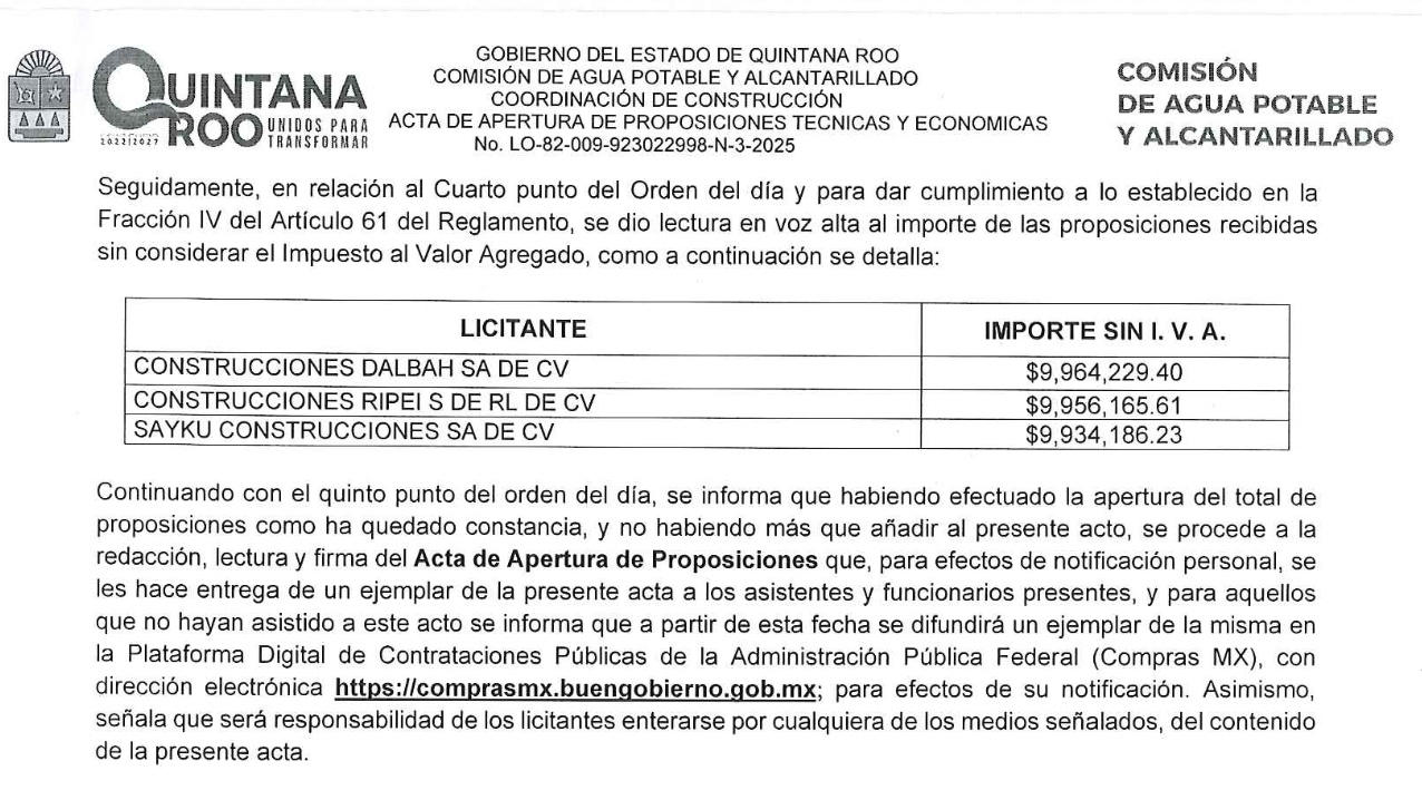 Para la licitación IO-82-009-923022998-N-7-2025, para ampliación y rehabilitación del sistema de abastecimiento de agua potable de la localidad de Sabán, municipio de José María Morelos (Primera etapa), donde fueron invitadas los siguientes proveedores: Cobor Construcciones SA de CV, constituida en Chetumal, QR, por Diego Cortés Arzola y Leticia Borjas Arzola, que ofertó $4’487,481.15 pesos; Construcciones e Ingeniería Villacoral SA de CV, de Chetumal, QR, de Suemy Concepción Blanco Dzul, con $4’499,846.64 pesos; y la persona física Irujari del Carmen Carrillo Peraza, con $4’480,594.70 pesos.