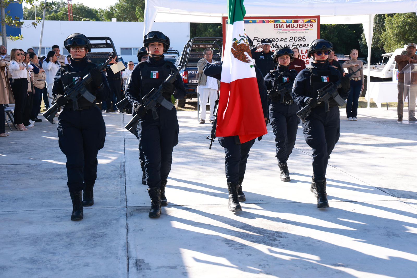Isla Mujeres.-En el marco de la ceremonia de honores a la bandera del mes de febrero, que se realizó en las instalaciones de la Secretaría Municipal de Seguridad Ciudadana, se dieron a conocer los logros más relevantes en materia de seguridad en Isla Mujeres.