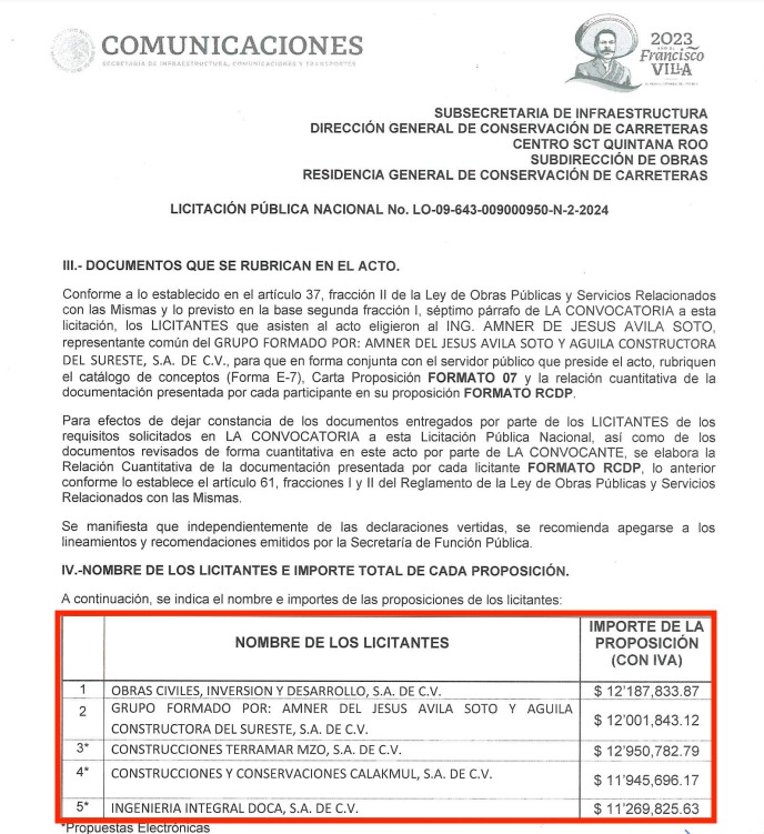 En la licitación LO-09-643-009000950-N-3-2024 para la conservación rutinaria de tramos en 150.13 km, de las rutas 184 carretera Mérida- Felipe Carrillo Puerto y 293 carretera Lázaro Cárdenas-Polyuc, se presentaron seis ofertas: Génesis Constructora y Comercializadora SA de CV y Comercializadora MEXGRO SA de CV (de Acapulco y Chilpancingo, Guerrero, respectivamente), con $10,394,604.77 pesos; IRS Genam S de RL de CV (Cancún, Q. Roo), $10,852,237.48; LCD-Once SA de CV (Toluca, EDOMEX), $11,166,946.74; Servicios Especializados para la Construcción CASBEC de Chiapas SA de CV (Tuxtla Gutiérrez, Chiapas), $11,218,463.91; Construcciones y Conservaciones Calakmul SA de CV (Campeche, Campeche) $11,517,584.25; y Obras Civiles, Inversión y Desarrollo SA de CV (Durango, Durango), con $12,299,240.61 pesos.