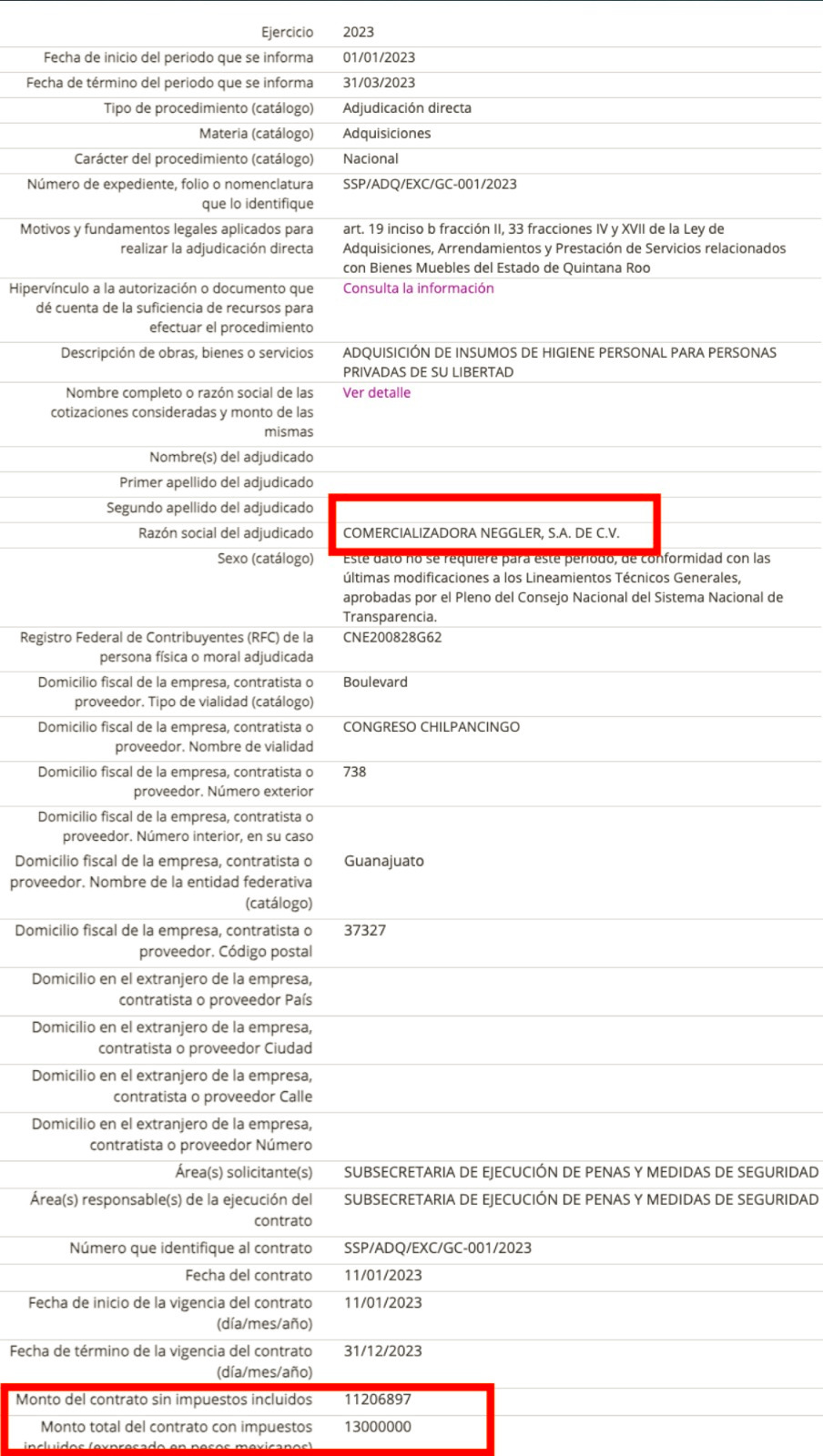 La empresa que se hizo de los servicios para la venta de insumos de higiene personal para personas privadas de su libertad, por un monto de 13 millones de pesos, es Comercializadora Neggler SA de CV, con domicilio fiscal en León, Guanajuato.