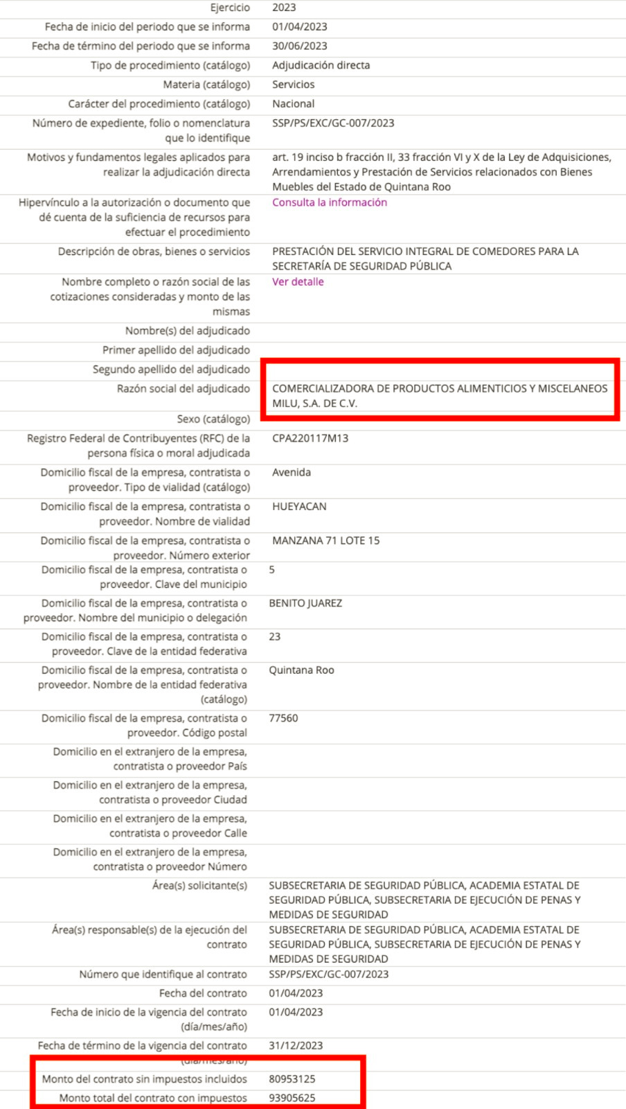 Para este millonario contrato, en el PNT aparece que la empresa Comercializadora de Productos Alimenticios y Misceláneos MILU tiene su domicilio fiscal en la calle, Huayacán, Manzana 71 Lote 15, en Cancún, Quintana Roo.
