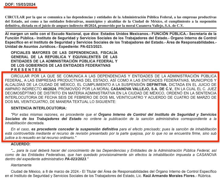 La empresa Casanova Vallejo obtuvo la suspensión definitiva o perdón a la sanción de 45 meses de inhabilitación hasta el pasado mes de marzo, pues de acuerdo al juicio de amparo PA-023/2023, publicado en el DOF del pasado 15 de marzo de 2024, se señala: “circular por la que se comunica a las dependencias y entidades de la administración pública federal, a las empresas productivas del estado, así como a las entidades federativas, municipios y alcaldías de la Ciudad de México, el cumplimiento a la suspensión definitiva, dictada en el juicio de amparo indirecto 48/2024, promovido por la moral Casanova Vallejo, S.A. de C.V., en la cual el C. Juez Decimoséptimo de Distrito en materia administrativa en la Ciudad de México, ordenó en la sentencia interlocutoria de fecha seis de febrero de 2024 y acuerdo de cuatro de marzo de 2024”.
