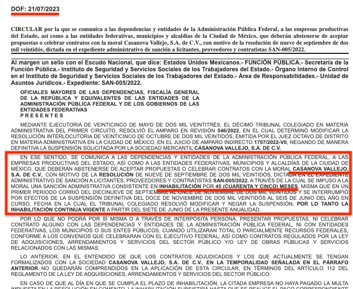 Según resolución expediente SAN-005/2022, publicado en el Diario Oficial de la Federación del 21 de julio de 2023, se señala lo siguiente: “Se comunica a las dependencias y entidades de la administración pública federal, a las empresas productivas del estado, así como a las entidades federativas, municipios y alcaldías de la Ciudad de México, que deberán abstenerse de aceptar propuestas o celebrar contratos con la moral Casanova Vallejo, S.A. de C.V., con motivo de la resolución de nueve de septiembre de dos mil veintidós, dictada en el expediente administrativo de sanción a licitantes, proveedores y contratistas SAN-005/2022, a través de la cual se impuso a la moral una sanción administrativa consistente en inhabilitación por 45 (cuarenta y cinco) meses, misma que en un primer periodo corrió del diecinueve de septiembre al once de noviembre de 2022 y se interrumpió por efectos de la suspensión definitiva del doce de noviembre de 2022 al seis de junio del año en curso, fecha en la cual el tribunal colegiado resolvió modificar y negar la suspensión, por lo tanto la inhabilitación continua vigente a partir del siete de junio de la presente anualidad”.