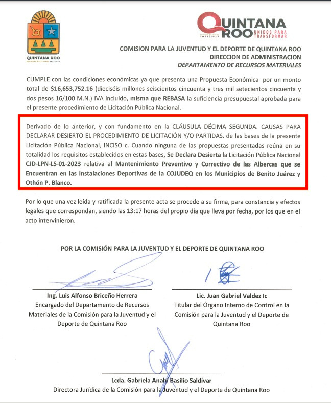 Lo extraño, es que la COJUDEQ reporta que dos días después que el fallo fue declarado desierto, es decir el 15 de marzo, firmó el contrato CJD/AD/PS/004/2023 con la misma empresa Corporati-vo Industrial Abdullah para el servicio de mantenimiento preventivo y correctivo de las albercas que se encuentran en las instalaciones deportivas de la COJUDEQ en los municipios de Benito Juárez y Othón P. Blanco, que fue adjudicado ya sin licitación de por medio.