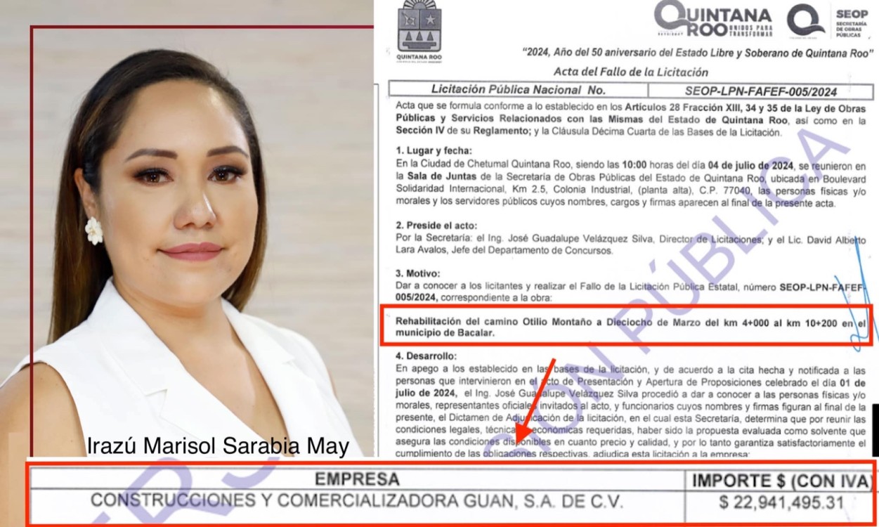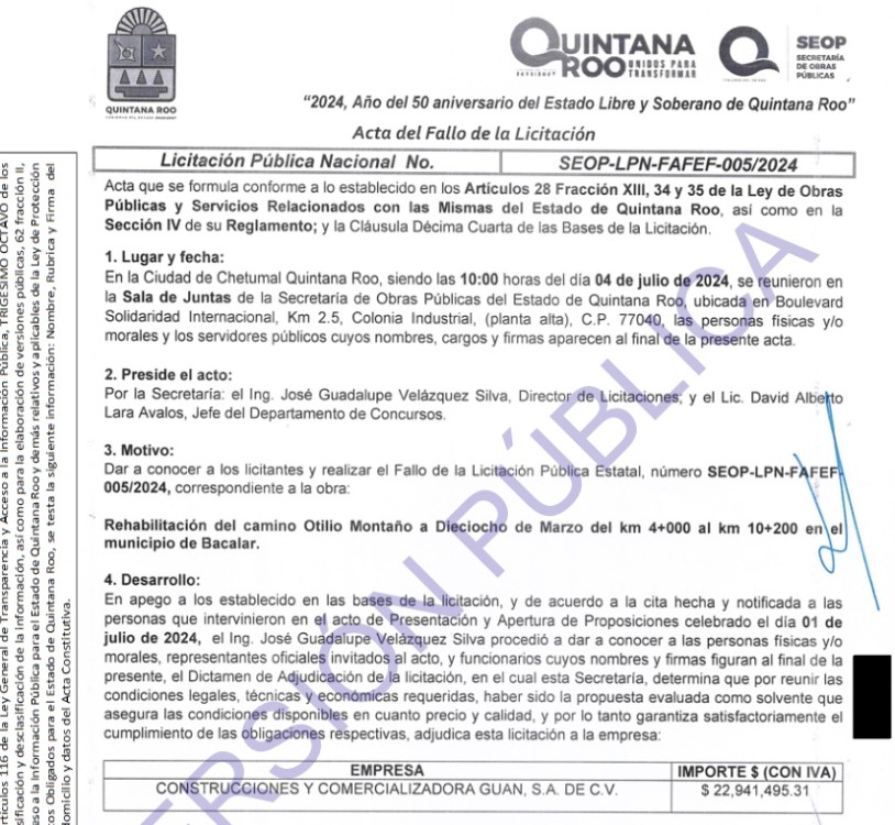 El pasado mes de julio, la empresa tabasqueña se llevó la licitación SEOP-LPN-FAFEF-005/2024 por un monto de $22 millones 941 mil 495.31 pesos.