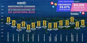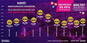 De la misma manera, la funcionaria electoral destacó que con un porcentaje del 80.3% de participación ciudadana en las elecciones del 2 de junio, el municipio de José María Morelos fue el que obtuvo el mayor número de ciudadanía que acudió a las urnas a votar, en contraste, el municipio con menor afluencia de votantes en toda la entidad fue Solidaridad con un 51.4%.