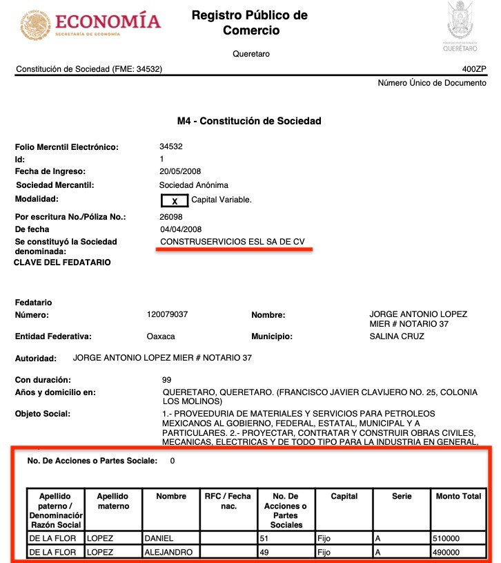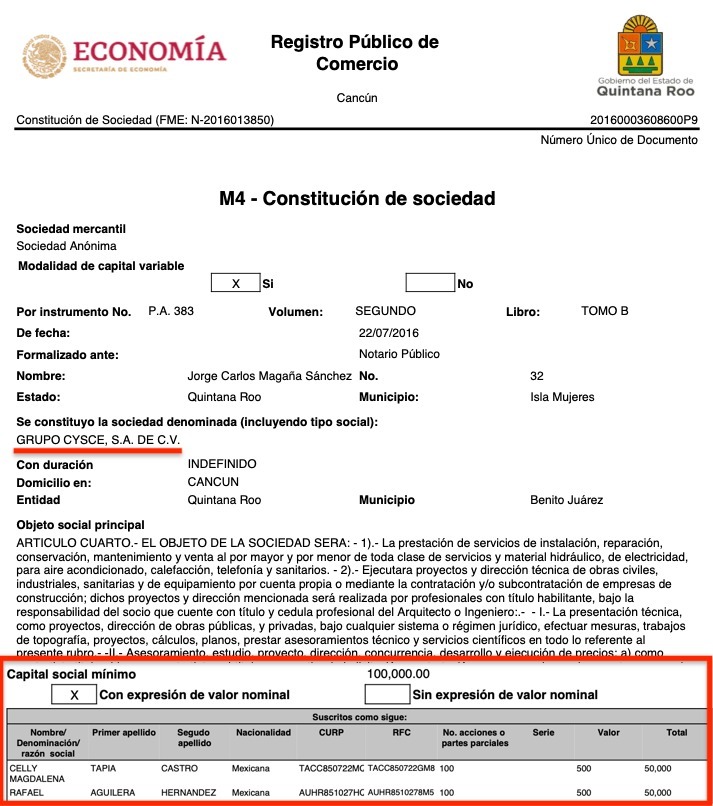 Las coincidencias de los apellidos de los socios o accionistas no es lo único en común que tienen las dos empresas, sino que ambas fueron constituidas ante la fe del Notario Público No. 32, Jorge Carlos Magaña Sánchez, de Isla Mujeres.