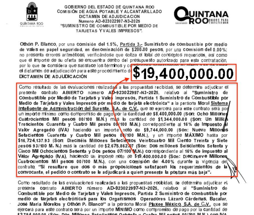 El primero de los contratos fue entregado sin licitación de por medio, mediante la adjudicación directa AD-923022997-N3-2025, por la Comisión de Agua Potable y Alcantarillado (CAPA) para el suministro de combustible por medio de tarjetas y vales impresos hasta el 31 de diciembre de 2025 por un monto máximo a ejercer de 19 millones 400 mil pesos.