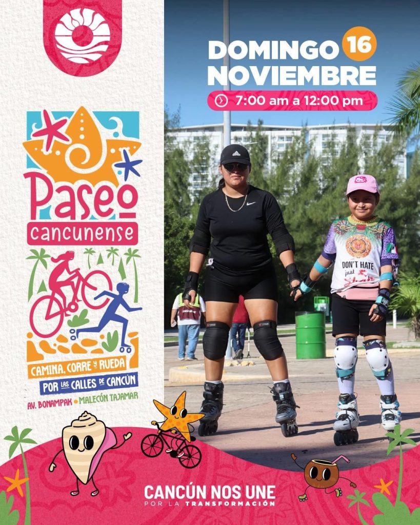 Cancún.- El Ayuntamiento de Benito Juárez, a través del Instituto Municipal de Planeación de Desarrollo Urbano (IMPLAN), realizará la 10ª edición del Paseo Cancunense, nuevamente en las inmediaciones de las avenidas Bonampak y Malecón Tajamar este domingo 16 de noviembre, con actividades para ciclistas, peatones, patinadores, familias con mascotas y todas las personas que quieran reconectar con la ciudad de una forma segura y activa.