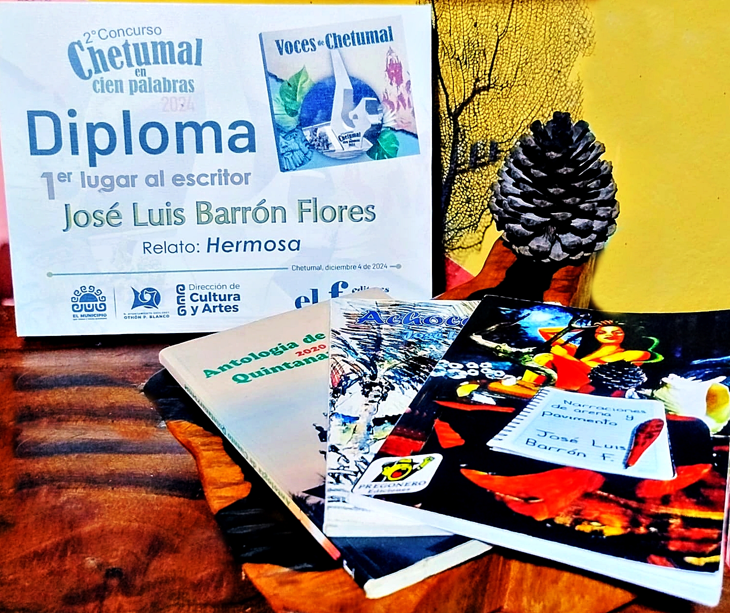 Entre ellos se encuentra “La noche del Manatí”, cuento que obtuvo el tercer lugar en la Antología del Cuento Quintanarroense 2020, así como “Hermosa”, relato ganador del primer lugar en el concurso literario “Chetumal en 100 palabras” 2024, por mencionar algunos de los más representativos.