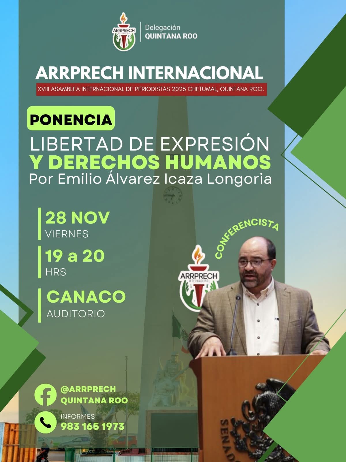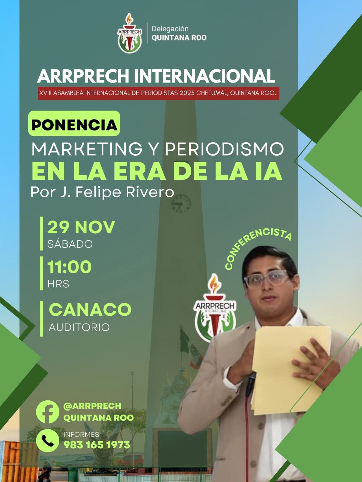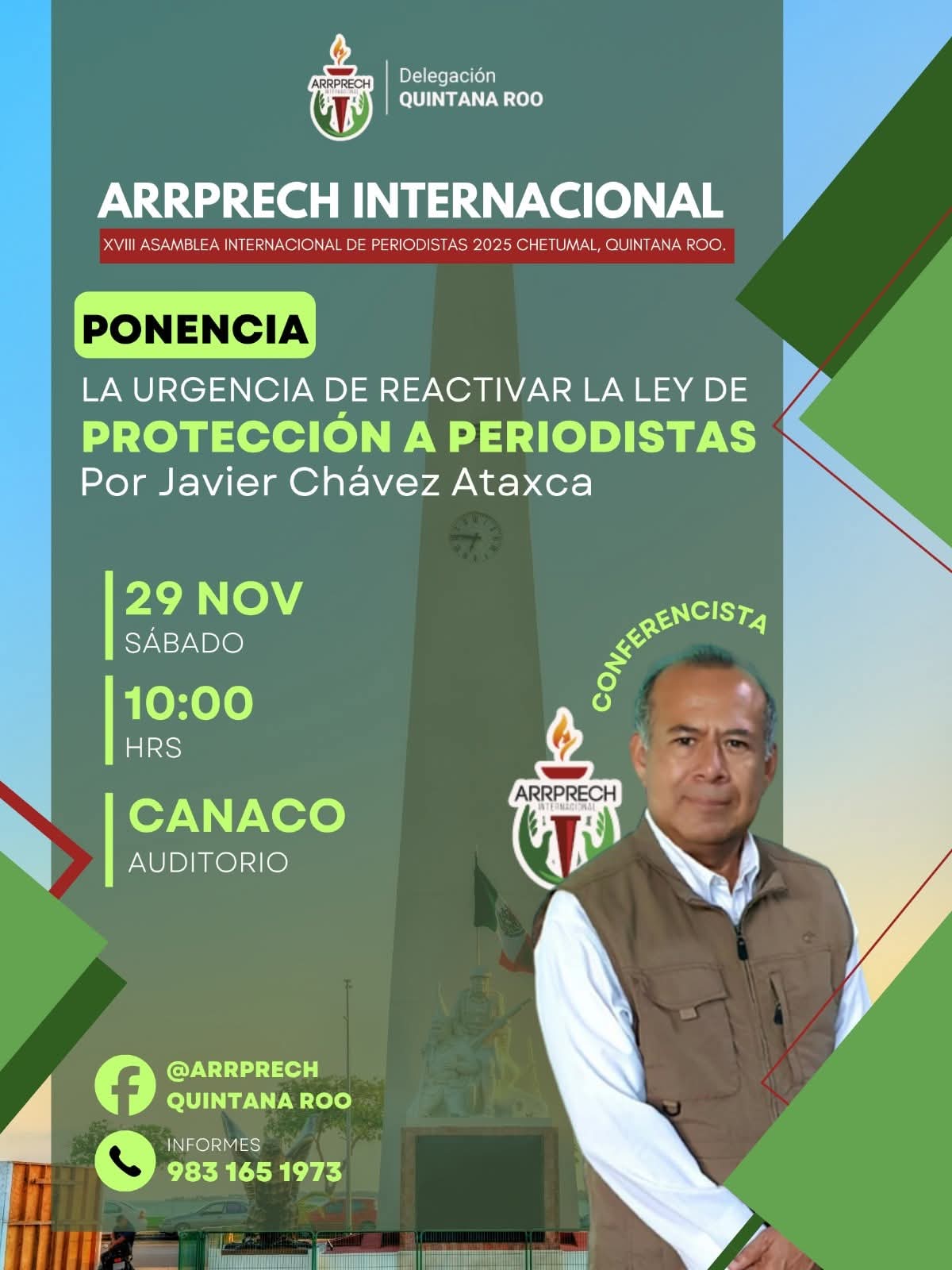 Teniendo como sede las instalaciones de la Cámara Nacional de Comercio (CANACO) en Chetumal, la Asociación de Redactores, Reporteros y Prensa Internacional (ARRPRECH) que preside la colega Mary Carmen Portillo inaugurará la XVIII Asamblea Internacional de Periodistas 2025, en la que se tiene prevista la presencia del dirigente a nivel global, Sergio Armando Marín, y profesionales de la comunicación de varias partes del país y del mundo.