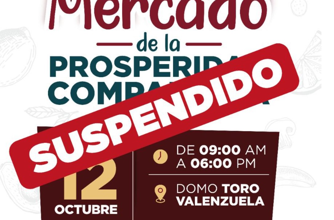 Cancún.- El Gobierno del Estado de Quintana Roo, en coordinación con el Ayuntamiento de Benito Juárez, informa que el evento “Mercado de la Prosperidad Compartida”, programado para el domingo 12 de octubre en el Domo Toro Valenzuela, queda suspendido hasta nuevo aviso.
