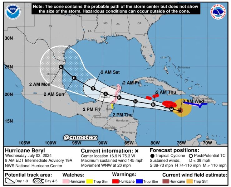 El huracán Beryl, ahora clasificado como un huracán de categoría 4, sigue su ruta a…